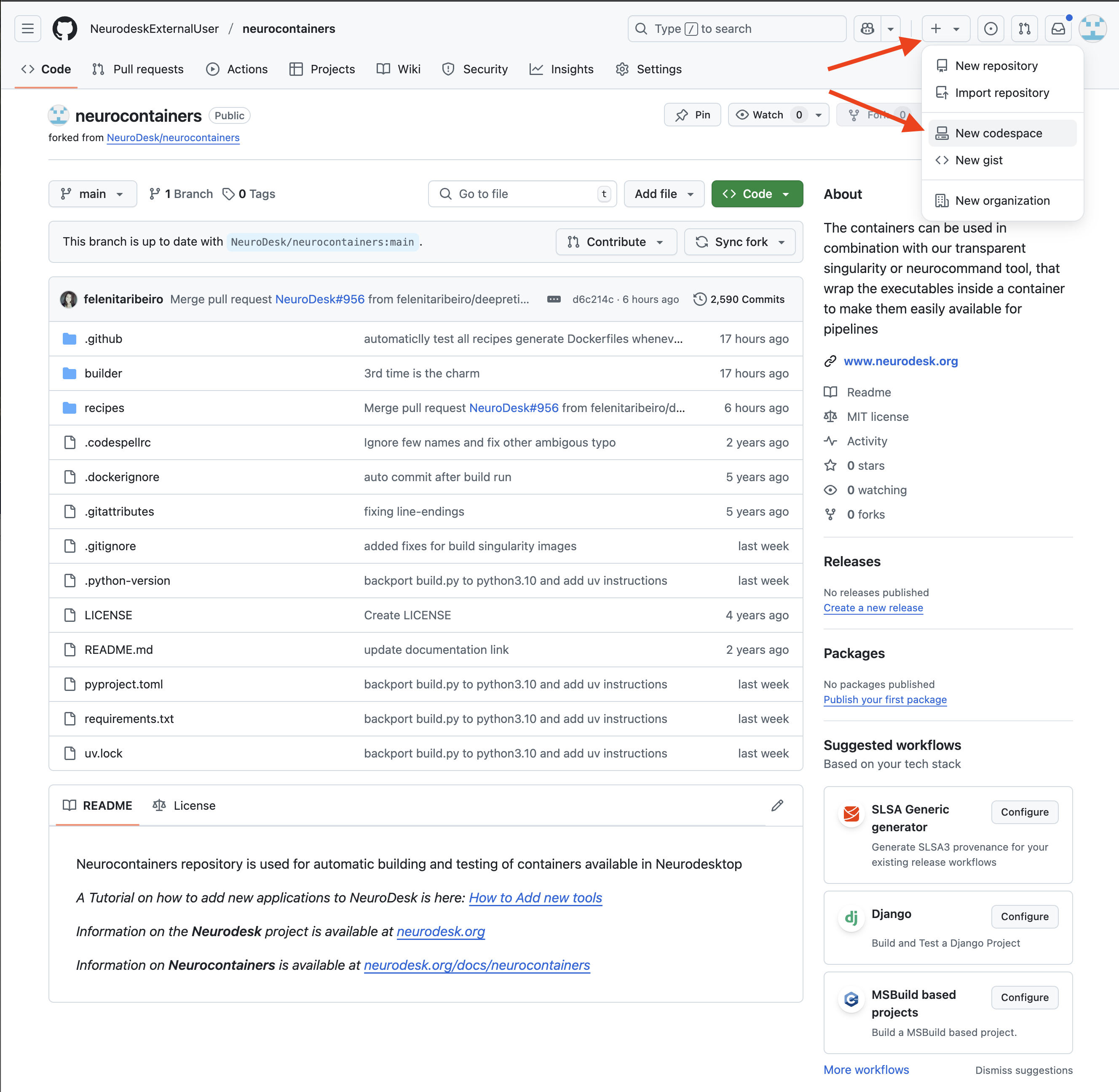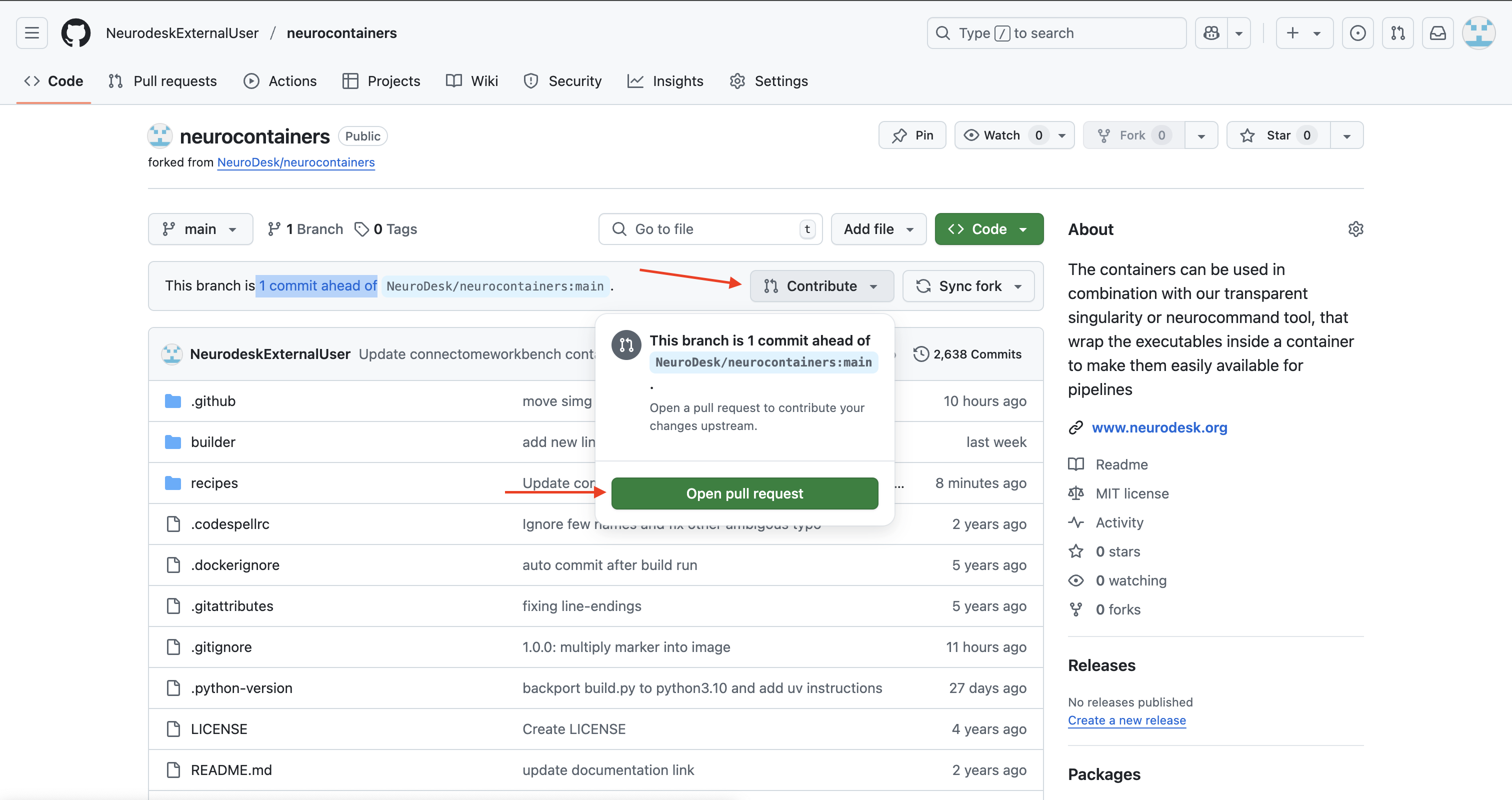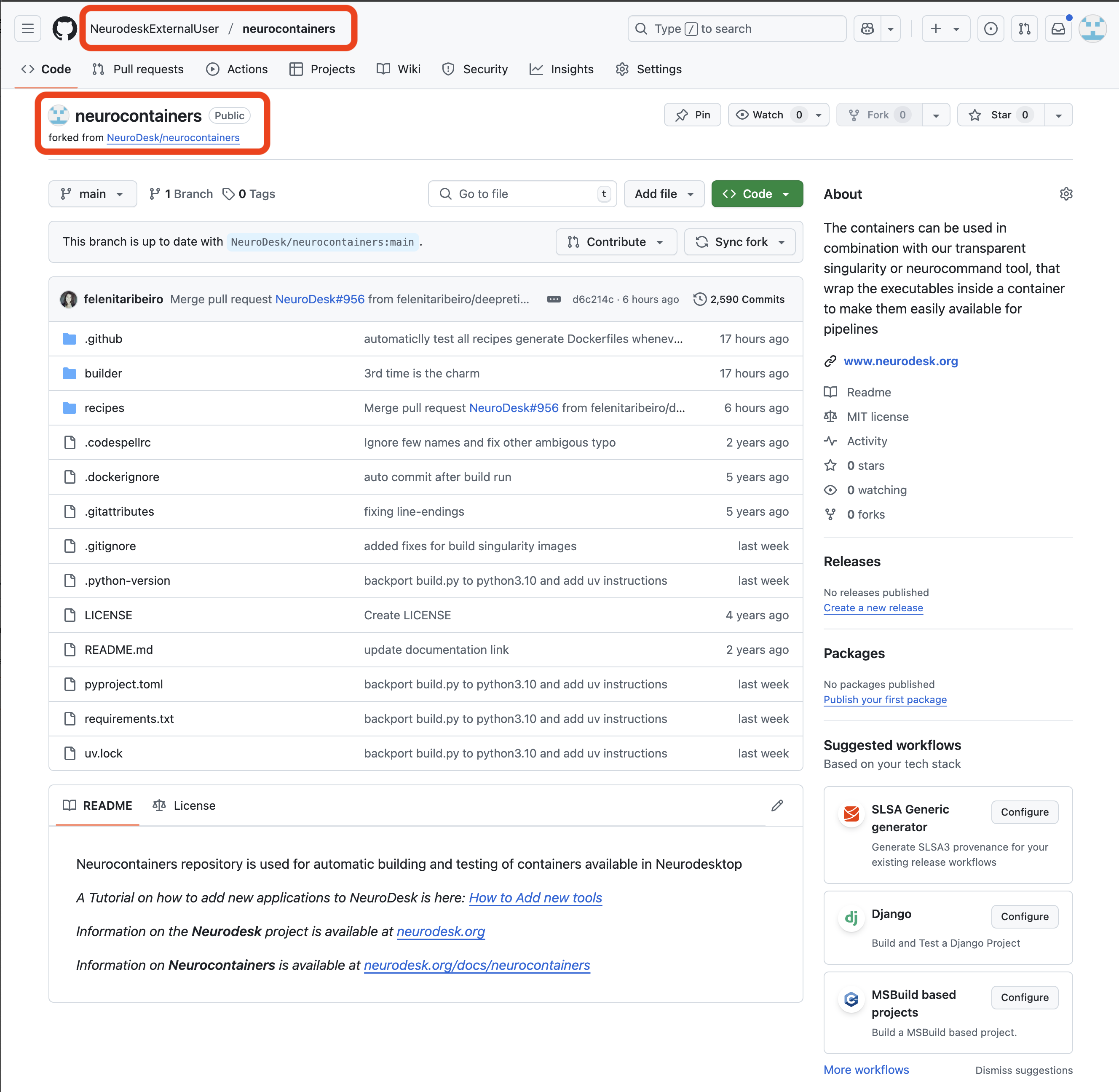 In the top left corner, you can see that you are in your forked repository of the neurocontainers repository.