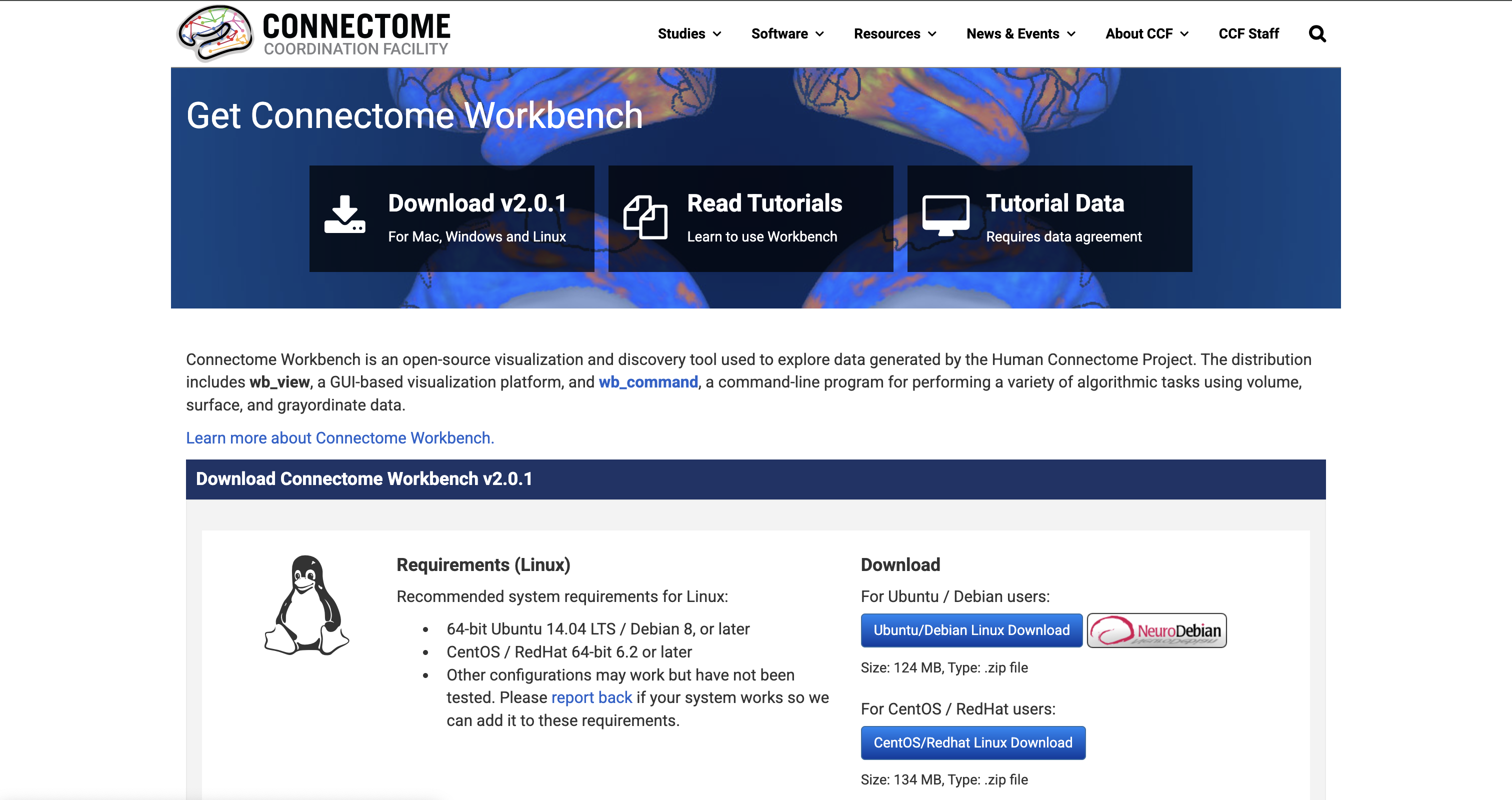 In this example, when we go to the Connectome Workbench website, we can see that the latest version available is Connectome Workbench v2.0.1.