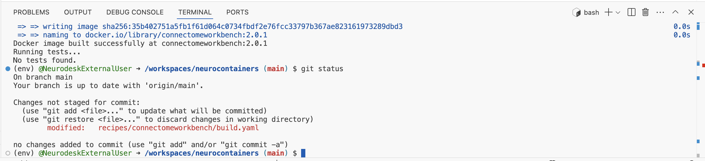 Once you see Docker image built successfully at connectomeworkbench:2.0.1, you are ready to commit and push your changes.