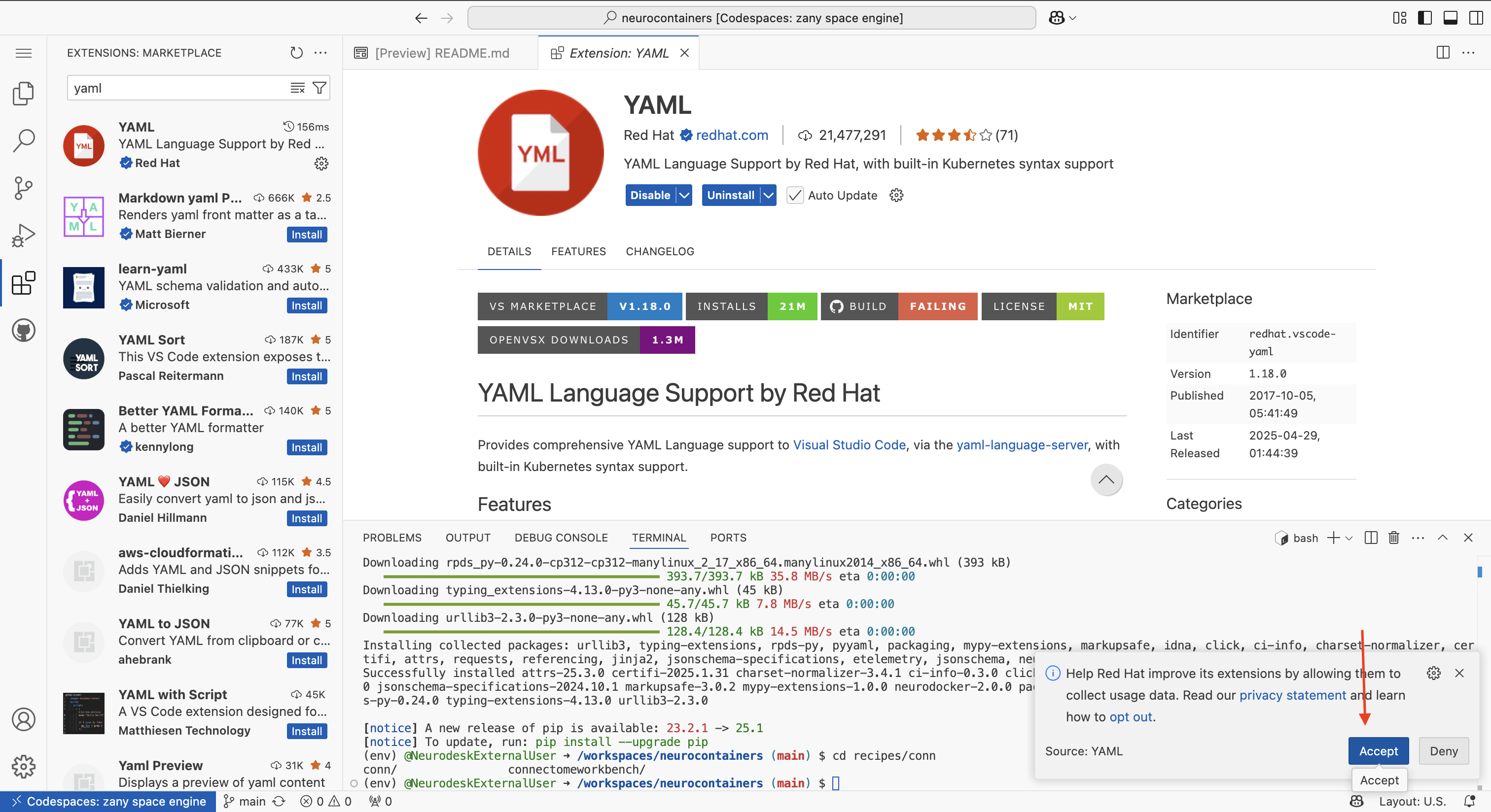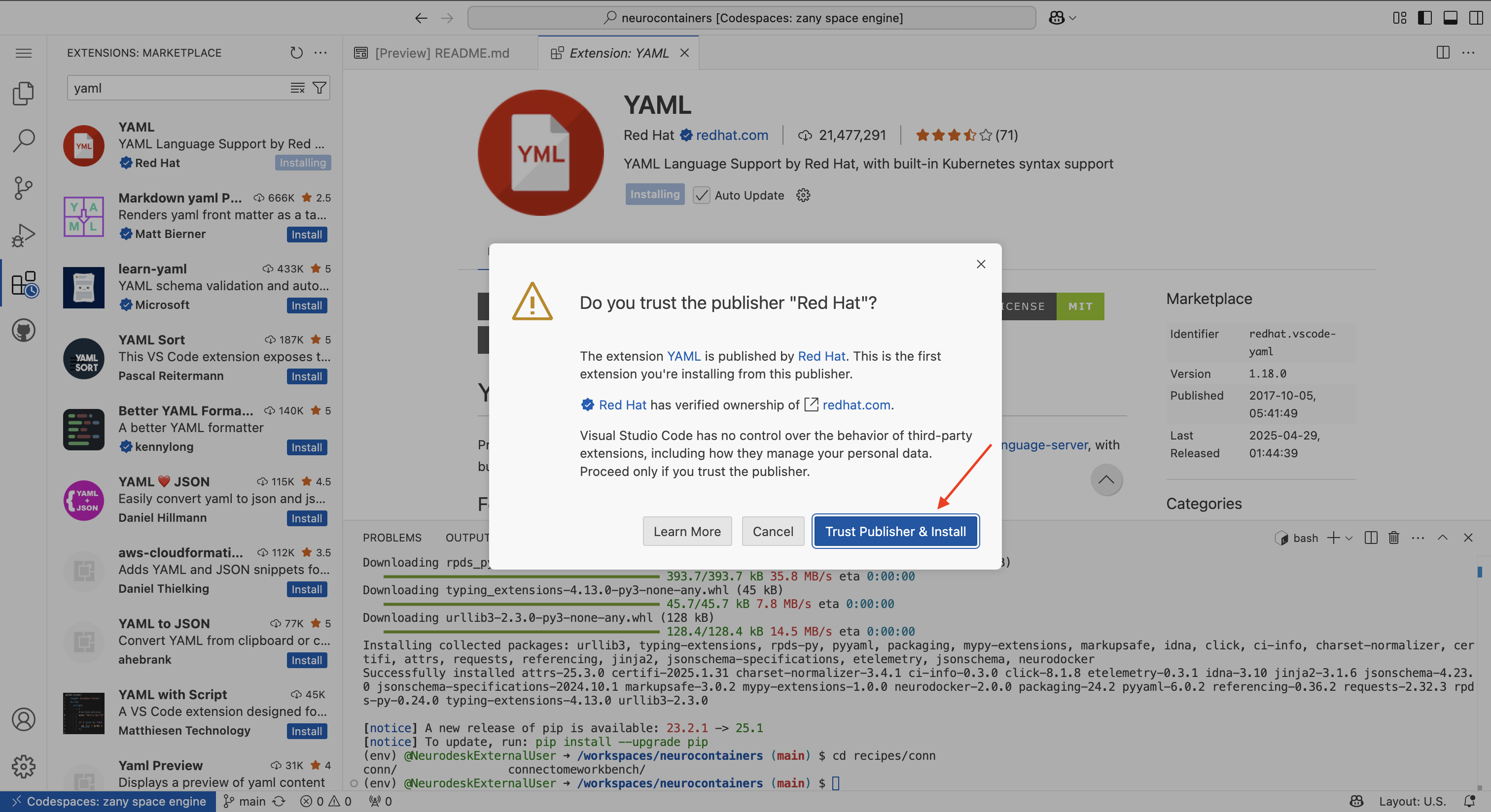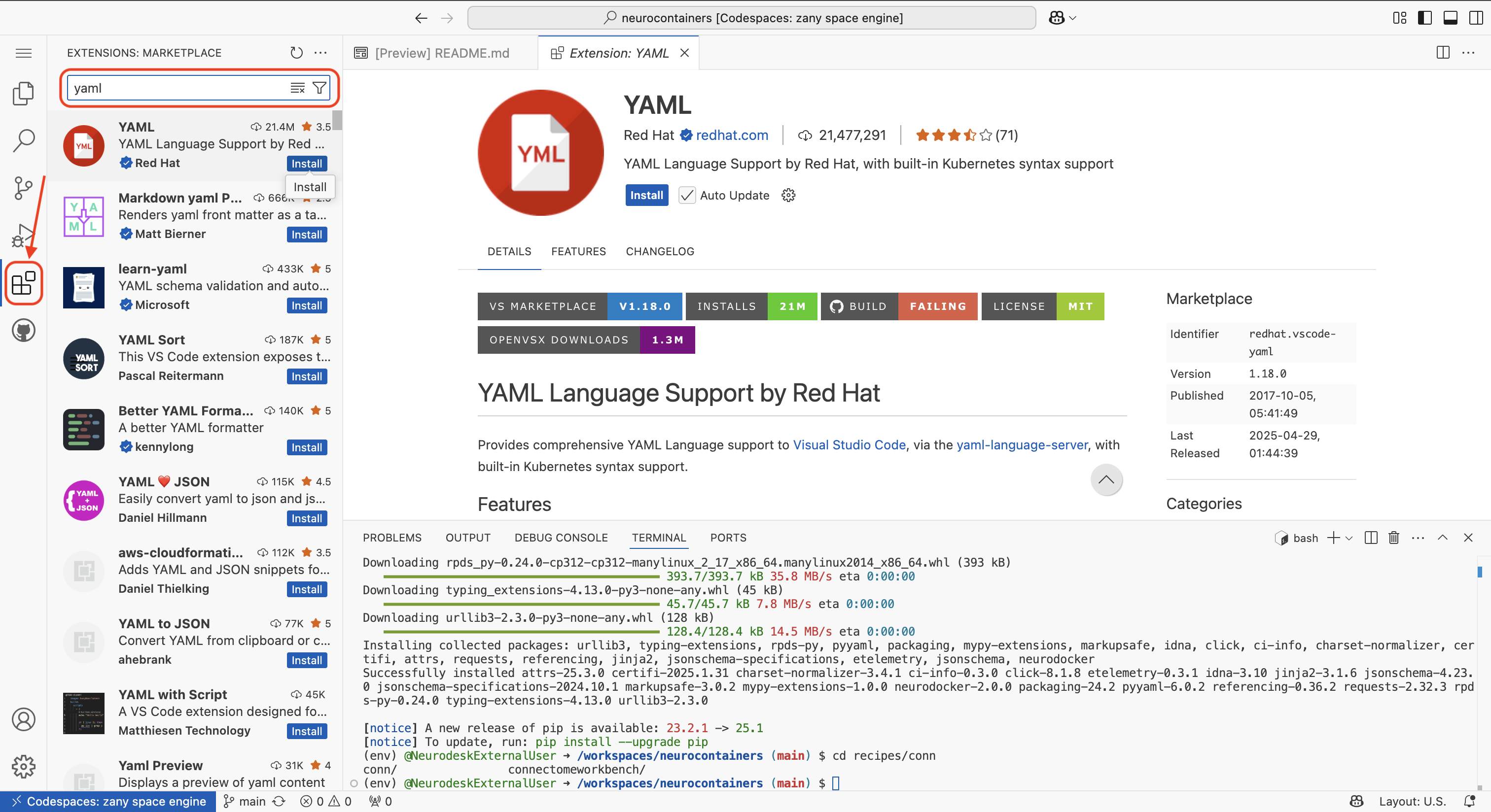 The first time you use a codespace, you will also need to download the YAML extension by navigating to the Extensions tab using icon on the left of your screen and searching for YAML. Click the install button.