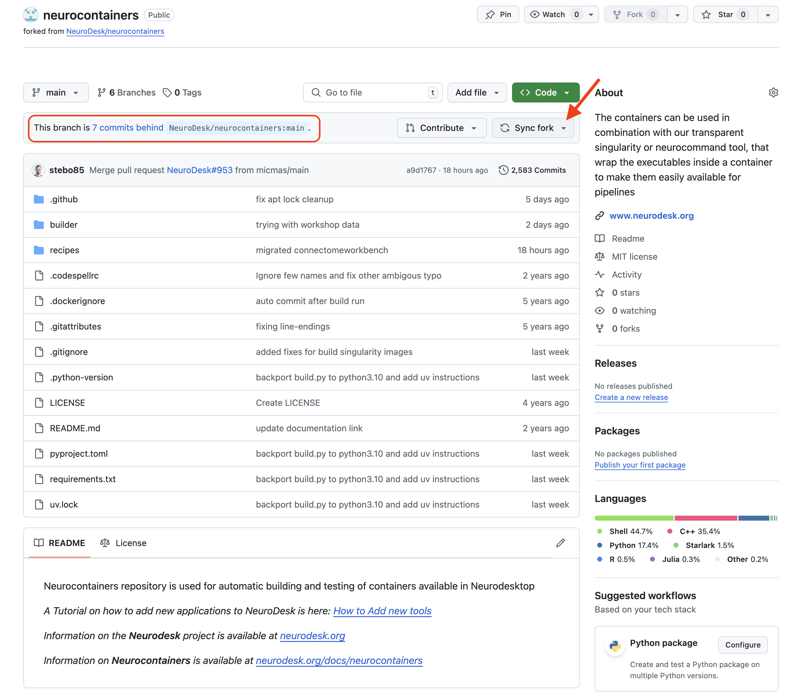 If changes are commited to the Neurodesk/neurocontainers repository, you will see a banner saying you are N commits behind. You may decide to Sync fork, which will update your repository, allowing you to have the most up-to-date files.