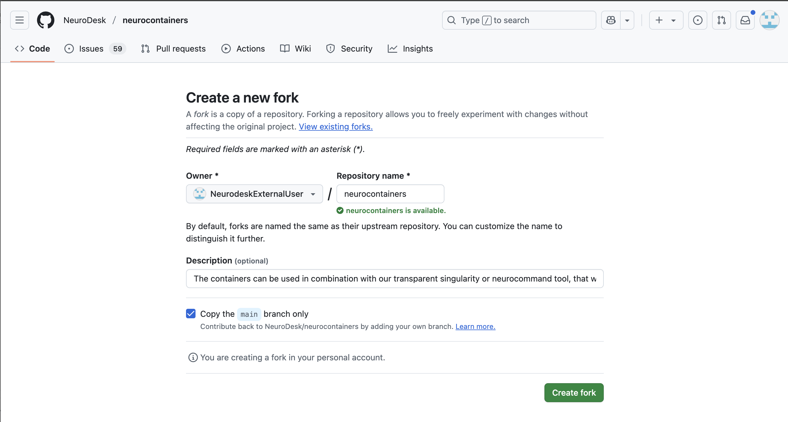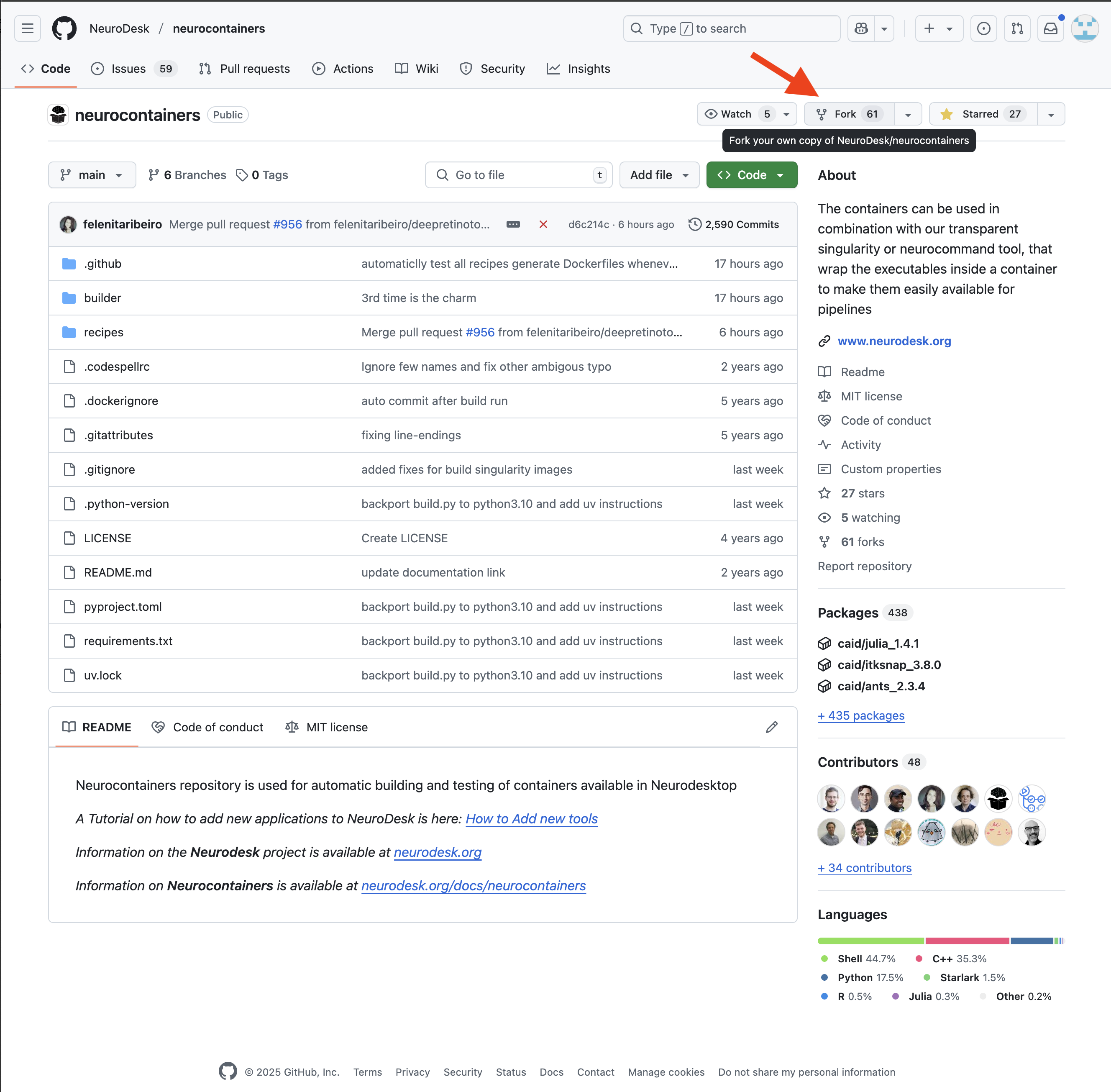 You will then need to fork the Neurodesk repository to your own repositories. This allows you to make changes independently and propose updates.